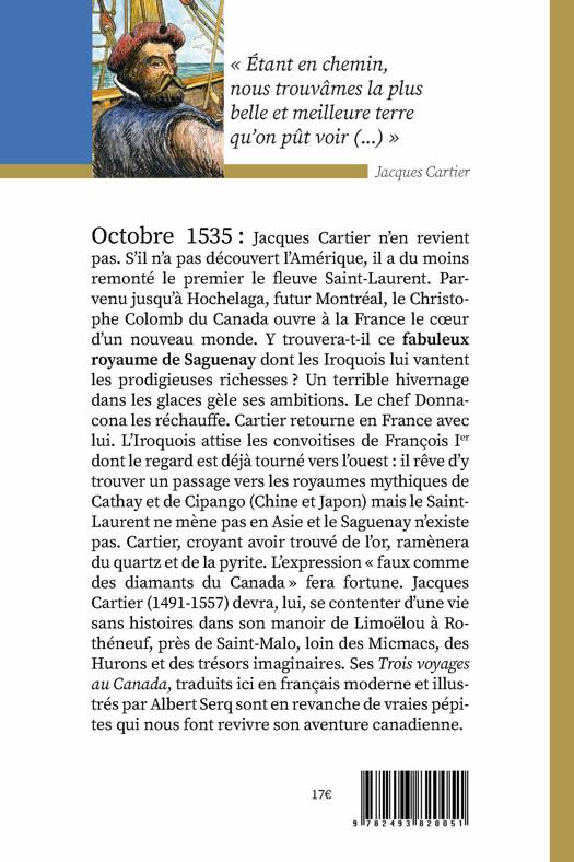 Octobre 1535 : Jacques Cartier n'en revient pas. S'il n'a pas découvert l'Amérique, il a du moins remonté le premier le fleuve Saint-Laurent. Parvenu jusqu'à Hochelaga, futur Montréal, le Christophe Colomb du Canada ouvre à la France le coeur d'un nouveau monde. Y trouvera-t-il ce fabuleux royaume de Saguenay dont les Iroquois lui vantent les prodigieuses richesses ? Un terrible hivernage dans les glaces gèle ses ambitions. Le chef Donnacona les réchauffe. Cartier retourne en France avec lui. L'Iroquois attise les convoitises de François Ier dont le regard est déjà tourné vers l'ouest : il rêve d'y trouver un passage vers les royaumes mythiques de Cathay et de Cipango (Chine et Japon) mais le Saint-Laurent ne mène pas en Asie et le Saguenay n'existe pas. Cartier, croyant avoir trouvé de l'or, ramènera du quartz et de la pyrite. L'expression « faux comme des diamants du Canada » fera fortune. Jacques Cartier (1491-1557) devra, lui, se contenter d'une vie sans histoires dans son manoir de Limoëlou à Rothéneuf, près de Saint-Malo, loin des Micmacs, des Hurons et des trésors imaginaires. Ses Trois voyages au Canada, traduits ici en français moderne et illustrés par Albert Serq sont en revanche de vraies pépites qui nous font revivre son aventure canadienne.