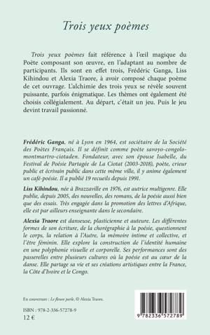 Trois yeux poèmes fait référence à l'oeil magique du Poète composant son oeuvre, en l'adaptant au nombre de participants. Ils sont en effet trois, Frédéric Ganga, Liss Kihindou et Alexia Traoré, à avoir composé chaque poème de cet ouvrage. L'alchimie des trois yeux se révèle souvent puissante, parfois énigmatique. Les thèmes ont également été choisis collégialement. Au départ, c'était un jeu. Puis le jeu devint travail passionné.