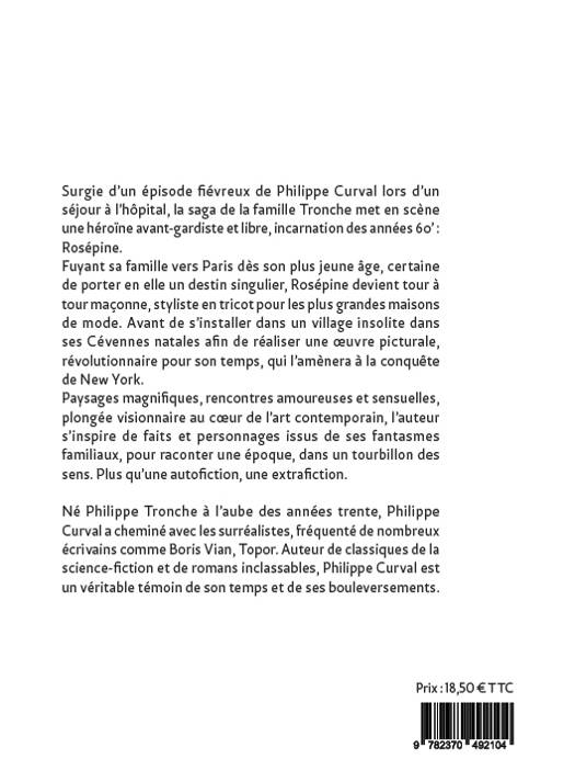 Surgie d’un épisode fiévreux de Philippe Curval lors d’un séjour à l’hôpital, la saga de la famille Tronche met en scène une héroïne avant-gardiste et libre, incarnation des années 60’ : Rosépine.Fuyant sa famille vers Paris dès son plus jeune âge, certaine de porter en elle un destin singulier, Rosépine devient tour à tour maçonne, styliste en tricot pour les plus grandes maisons de mode. Avant de s’installer dans un village insolite dans ses Cévennes natales afin de réaliser une œuvre picturale, révolutionnaire pour son temps, qui l’amènera à la conquête de New York.