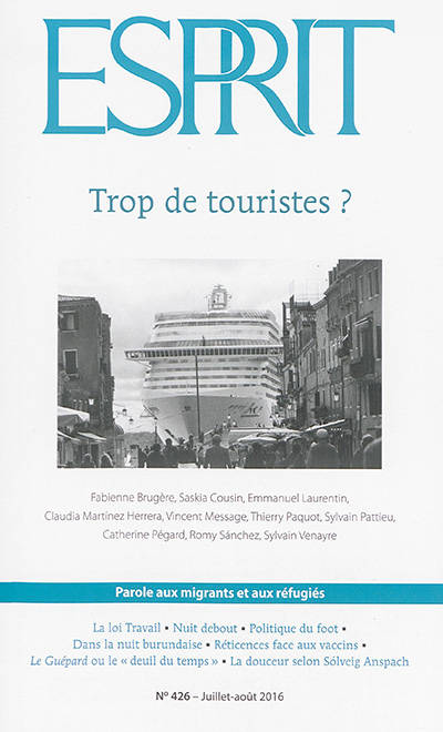 Entre désir de distinction et quête d'authenticité, le tourisme a pris différentes formes au cours de l'histoire. Le dossier estival de la revue Esprit, coordonné par Emmanuel Laurentin, interroge nos raisons de partir, quand il n'y a plus d'ailleurs où se perdre, ainsi que les effets du tourisme de masse sur la diversité du monde, des sites désertés aux grandes capitales européennes. Le numéro donne également la parole aux réfugiés, examine la crise politique autour de la loi travail, parle de la politique du football, raconte le Burundi et Nuit debout, et propose une abondante recension de l'actualité éditoriale.