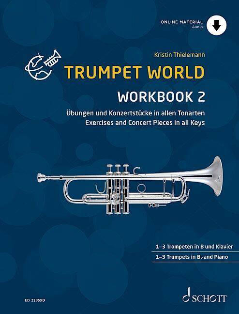 This booklet makes you want to practice scales and etudes! Important studies and etudes for slightly advanced trumpet players are supplemented by piano accompaniments or duet parts, thus opening up chamber music interaction and promoting harmonious playing. On the journey through the „Trumpet World“ instrumental fitness and fluency on the trumpet are developed in a playful way through a skillful combination of familiar and new exercises and playing techniques. The book covers major and minor keys with three or more accidentals. Includes accompanying materials such as piano parts and demo versions, recorded by renowned artists. Instrumentation: 1–3 trumpets in Bb and piano ad lib.
