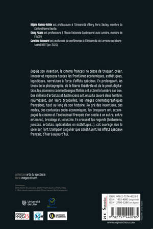 Depuis son invention, le cinéma français ne cesse de truquer, créer, innover et repousse toutes les frontières économiques, esthétiques, logistiques, narratives à force d’effets spéciaux. En prolongeant les trucs de la photographie, de la féerie théâtrale et de la prestidigitation, les pionniers comme Georges Méliès ont attiré la lumière sur eux. Des milliers d’artistes et techniciens ont ensuite oeuvré dans l’ombre, nourrissant, par leurs trouvailles, les images cinématographiques françaises, tout au long de son histoire. Au gré des inventions, des modes, des contextes socio-économiques, les truqueurs ont accompagné le cinéma et l’audiovisuel français d’un siècle à un autre, entre artisanat, bricolage et industrie. En croisant les regards (historiens, juristes, artistes, spécialistes en esthétique…), cet ouvrage lève le voile sur l’art trompeur singulier que constituent les effets spéciaux français, d’hier à aujourd’hui.