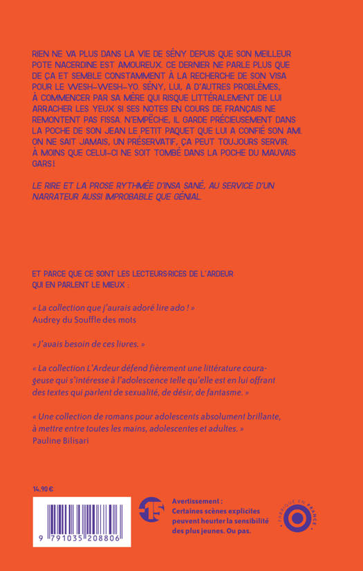 Rien ne va plus dans la vie de Sény depuis que son meilleur pote Nacerdine est amoureux. Ce dernier ne parle plus que de ça et semble constamment à la recherche de son visa pour le wesh-wesh-yo. Sény, lui, a d'autres problèmes, à commencer par sa mère qui risque littéralement de lui arracher les yeux si ses notes en cours de français ne remontent pas fissa. N'empêche, il garde précieusement dans la poche de son jean le petit paquet que lui a confié son ami. On ne sait jamais, un préservatif, ça peut toujours servir. À moins que celui-ci ne soit tombé dans la poche du mauvais gars !