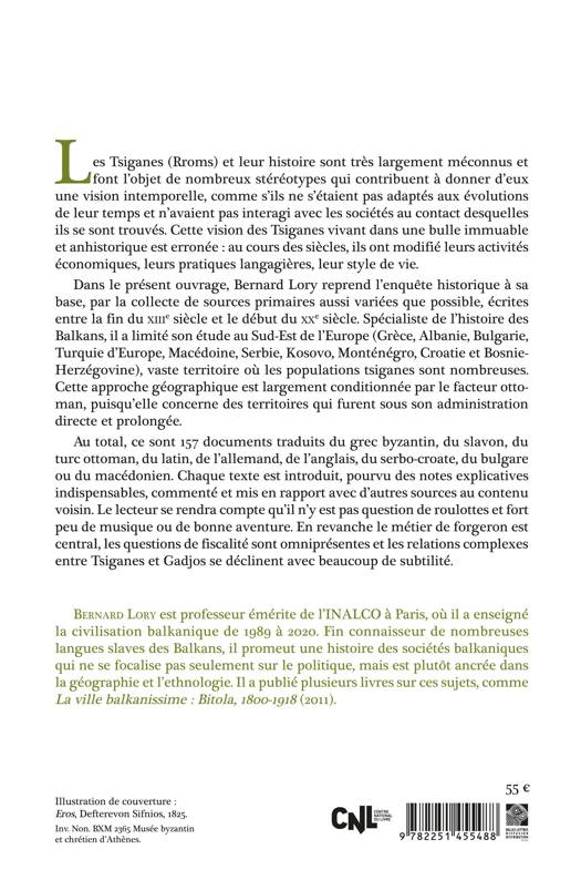 Les Tsiganes (Rroms) et leur histoire sont tres largement meconnus et font l'objet de nombreux stereotypes qui contribuent a donner d'eux une vision intemporelle, comme s'ils ne s'etaient pas adaptes aux evolutions de leur temps et n'avaient pas interagi avec les societes au contact desquelles ils se sont trouves. Cette vision des Tsiganes vivant dans une bulle immuable et anhistorique est erronee: au cours des siecles, ils ont modifie leurs activites economiques, leurs pratiques langagieres, leur style de vie. Dans le present ouvrage, Bernard Lory reprend l'enquete historique a sa base, par la collecte de sources primaires aussi variees que possible, ecrites entre la fin du XIIIe siecle et le debut du XXe siecle. Specialiste de l'histoire des Balkans, il a limite son etude au Sud-Est de l'Europe (Grece, Albanie, Bulgarie, Turquie d'Europe, Macedoine, Serbie, Kosovo, Montenegro, Croatie et Bosnie-Herzegovine), vaste territoire ou les populations tsiganes sont nombreuses. Cette approche geographique est largement conditionnee par le facteur ottoman, puisqu'elle concerne des territoires qui furent sous son administration directe et prolongee. Au total, ce sont 157 documents traduits du grec byzantin, du slavon, du turc ottoman, du latin, de l'allemand, de l'anglais, du serbo-croate, du bulgare ou du macedonien. Chaque texte est introduit, pourvu des notes explicatives indispensables, commente' et mis en rapport avec d'autres sources au contenu voisin. Le lecteur se rendra compte qu'il n'y est pas question de roulottes et fort peu de musique ou de bonne aventure. En revanche le metier de forgeron est central, les questions de fiscalite sont omnipresentes et les relations complexes entre Tsiganes et Gadjos se declinent avec beaucoup de subtilite.
