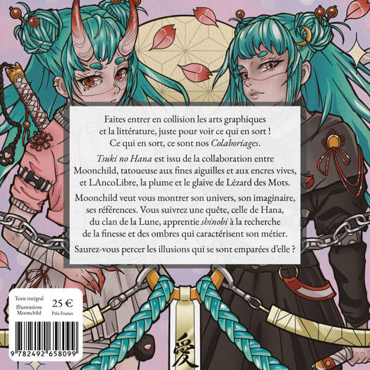 Faites entrer en collision les arts graphiques et la littérature, juste pour voir ce qui en sort ! Ce qui en sort, ce sont nos Colaboriages. Tsuki no Hana est issu de la collaboration entre Moonchild, tatoueuse aux fines aiguilles et aux encres vives, et LAncoLibre, la plume et le glaive de Lézard des Mots. Moonchild veut vous montrer son univers, son imaginaire, ses références. Vous suivrez une quête, celle de Hana, du clan de la Lune, apprentie shinobi à la recherche de la finesse et des ombres qui caractérisent son métier. Saurez-vous percer les illusions qui se sont emparées d’elle ?