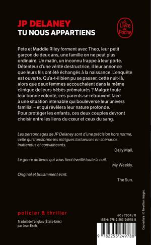 Pete et Maddie Riley forment avec Theo, leur petit garçon de deux ans, une famille on ne peut plus ordinaire. Un matin, un inconnu frappe à leur porte. Détenteur d’une vérité destructrice, il leur annonce que leurs fils ont été échangés à la naissance. L’enquête est ouverte. Qu’a-t-il bien pu se passer, cette nuit-là, alors que deux femmes accouchaient dans la même clinique de leurs bébés prématurés ? Malgré toute leur bonne volonté, ces parents se retrouvent face à une situation intenable qui bouleverse leur univers familial – et qui révélera leur nature profonde. Pour protéger les enfants, ces deux couples devront choisir entre les liens du cœur ou ceux du sang.