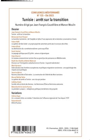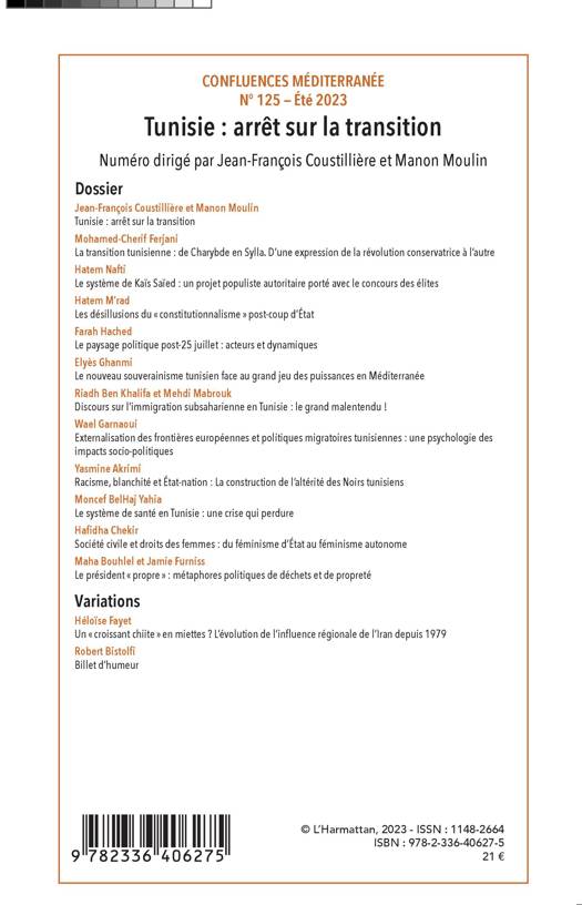 Au sommaire: Tunisie: arrêt sur la transition; La transition tunisienne: de Charybde en Sylla. D'une expression de la révolution conservatrice à l'autre; Le système de Kaïs Saïed: un projet populiste autoritaire porté avec le concours des élites; Les désillusions du constitutionnalisme post-coup d'État; Le paysage politique post-25 juillet: acteurs et dynamiques; Le nouveau souverainisme tunisien face au grand jeu des puissances en Méditerranée; Discours sur l'immigration subsaharienne en Tunisie: le grand malentendu !; Externalisation des frontières européennes et politiques migratoires tunisiennes: une psychologie des impacts socio-politiques; Racisme, blanchité et État-nation: La construction de l'altérité des Noirs tunisiens; Le système de santé en Tunisie: une crise qui perdure; Société civile et droits des femmes: du féminisme d'État au féminisme autonome; Le président propre: métaphores politiques de déchets et de propreté.