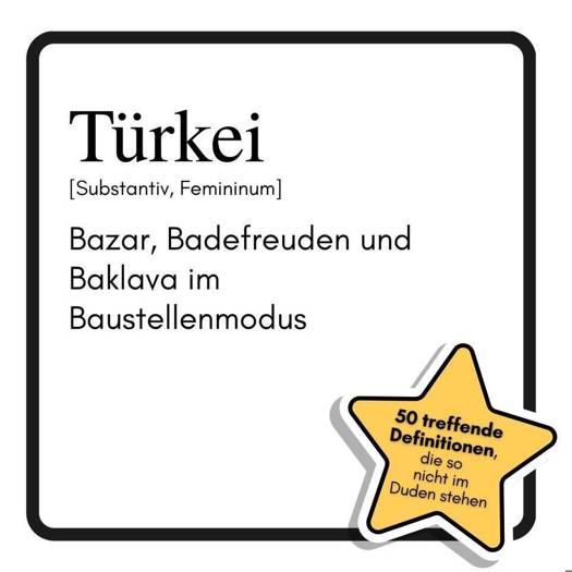 Wer glaubt, die Türkei sei nur Sonne, Strand und Baklava, hat noch nie erlebt, wie sich zwischen antiken Ruinen, duftenden Basaren und dampfenden Hamams plötzlich ein Presslufthammer meldet. "Türkei: Bazar, Badefreuden und Baklava im Baustellenmodus" serviert 50 humorvolle Definitionen samt Illustrationen, die zeigen, wie das Land zwischen Tradition und Modernisierung auf ganz eigene Weise funktioniert.Für wen dieses Buch optimal geeignet ist:- Für Türkei-Fans mit Sinn für Ironie und Augenzwinkern- Für Reiselustige, die mehr als nur Reiseführer-Floskeln suchen- Für alle, die beim Gedanken an Baklava und Baustellen schmunzeln müssenEin witziger Streifzug von Istanbul bis Kappadokien, von Raki bis Nazar Boncugu, der die kleinen und großen Eigenheiten der Türkei liebevoll aufs Korn nimmt.Was beim Kauf dieses Buches erwartet werden kann:- 50 pointierte Definitionen zu Land, Leuten und Lebensart- Passende Illustrationen zu jedem Eintrag- Ein originelles Geschenk für Türkei-Liebhaber- Humorvolle Einblicke in Kultur, Küche und Alltag