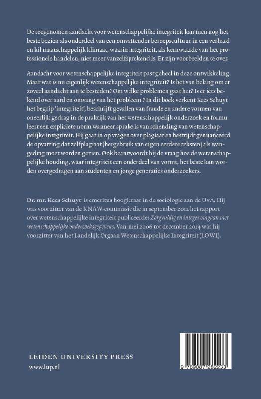 De toegenomen aandacht voor integriteit kan men nog het beste bezien als onderdeel van een omvattender beroepscultuur in een verhard en kil maatschappelijk klimaat, waarin integriteit, als kernwaarde van het professionele handelen, niet meer vanzelfsprekend is. Er zijn voorbeelden te over. Aandacht voor wetenschappelijke integriteit past geheel in deze ontwikkeling. Maar wat is nu eigenlijk wetenschappelijke integriteit? Is het van belang om er zoveel aandacht aan te besteden? Om welke problemen gaat het? Is er iets bekend over aard en omvang van het probleem ? In dit boek verkent Kees Schuyt het begrip 'integriteit', beschrijft gevallen van fraude en andere vormen van oneerlijk gedrag in de praktijk van het wetenschappelijk onderzoek en formuleert een expliciete norm wanneer sprake is van schending van wetenschappelijke integriteit. Hij gaat in op vragen over plagiaat en bestrijdt genuanceerd de opvatting dat zelfplagiaat (hergebruik van eigen teksten) als wangedrag moet worden gezien. Ook beantwoordt hij de vraag hoe de wetenschappelijke houding, waar integriteit een onderdeel van vormt, het beste kan worden overgedragen aan studenten en jonge generaties onderzoekers.
