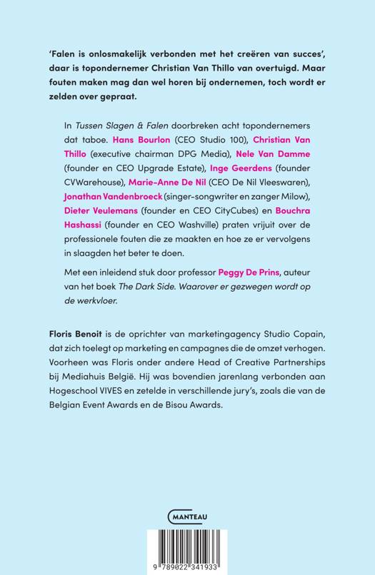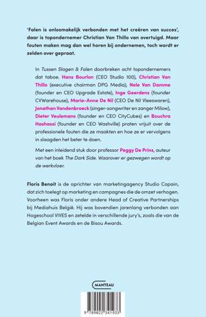 In Tussen Slagen & Falen doorbreken acht topondernemers dat taboe. Hans Bourlon (CEO Studio 100), Christian Van Thillo (executive chairman DPG Media), Nele Van Damme (founder en CEO Upgrade Estate), Inge Geerdens (founder CVWarehouse), Marie-Anne De Nil (CEO De Nil Vleeswaren), Jonathan Vandenbroeck (singer-songwriter en zanger Milow), Dieter Veulemans (founder en CEO CityCubes) en Bouchra Hashassi (founder en CEO Washville) praten vrijuit over de professionele fouten die ze maakten en hoe ze er vervolgens in slaagden het beter te doen.