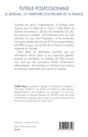 Soixante ans après l'indépendance, le Sénégal reste toujours sous la tutelle de la France. Cette tutelle est d'abord économique: 28 des 40 entreprises du CAC 40 opèrent au Sénégal; 29 entreprises parmi les 100 premières du pays sont françaises; et celles-ci représentent plus de 25% du produit intérieur brut du pays. Ce qui fait de la France la première entreprise du Sénégal. Cette tutelle est démontrée, explicitée puis ses mécanismes décrits grâce à une approche globale, factuelle et scientifique. La stratégie de l'Etat français ainsi que ses modes d'intervention diplomatiques, économiques et militaires pour exercer et pérenniser cette tutelle sont cernés et analysés.