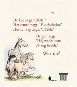 De koe zegt boe. Het paard zegt huuhuhuhu. Tot zover geen probleem. Maar als het schaap bèèèh zegt, onderbreekt de geit hem. Want de geit zegt óók bèèèh. Wat nu? Alle dieren willen hun eigen geluid! Na wat geharrewar krijgt het schaap een goed idee: wat als hij iets zegt dat nog nooit iemand heeft gezegd? En zo roept hij uit volle borst: Tuut tuut woekelie wuut wopperdehop klip klop jekkie plekkie pruuuuuuuuut!