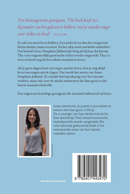 'Je zult een mooi leven hebben. Een ander leven dan dat van gewone kleine meisjes, maar een mooi. En het zal je nooit aan liefde ontbreken.' Dat belooft Anne-Dauphine Julliand plechtig als bij haar dochtertje Thaïs een ongeneeslijke genetische ziekte wordt vastgesteld. Thaïs is twee en heeft nog slechts enkele maanden te leven. Als je geen dagen kunt toevoegen aan het leven, kun je nog altijd leven toevoegen aan de dagen. Dat wordt het motto van Anne-Dauphine Julliand. Ze schrijft heel openhartig over het enorme verdriet, maar ook over de unieke momenten die haar gezin in die laatste maanden beleefde. Een ongewoon krachtige getuigenis die niemand onberoerd zal laten.