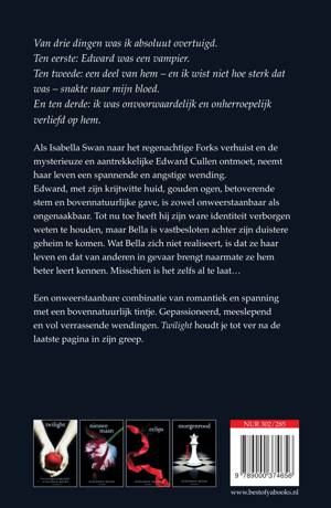 Een onweerstaanbare combinatie van romantiek en spanning met een bovennatuurlijk tintje. Gepassioneerd, meeslepend en vol verrassende wendingen. Twilight houdt je tot ver na de laatste pagina in zijn greep. Twilight is het eerste deel van de internationale bestsellerserie van Stephenie Meyer.