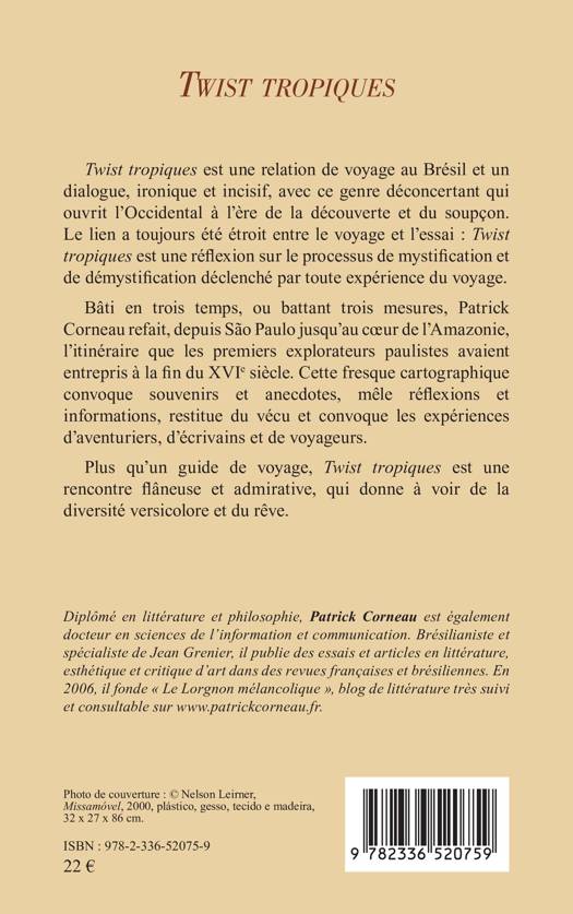 Twist tropiques est une relation de voyage au Brésil et un dialogue, ironique et incisif, avec ce genre déconcertant qui ouvrit l'Occidental à l'ère de la découverte et du soupçon. Le lien a toujours été étroit entre le voyage et l'essai: Twist tropiques est une réflexion sur le processus de mystification et de démystification déclenché par toute expérience du voyage. Bâti en trois temps, ou battant trois mesures, Patrick Corneau refait, depuis São Paulo jusqu'au coeur de l'Amazonie, l'itinéraire que les premiers explorateurs paulistes avaient entrepris à la fin du XVIe siècle. Cette fresque cartographique convoque souvenirs et anecdotes, mêle réflexions et informations, restitue du vécu et convoque les expériences d'aventuriers, d'écrivains et de voyageurs. Plus qu'un guide de voyage, Twist tropiques est une rencontre flâneuse et admirative, qui donne à voir de la diversité versicolore et du rêve.