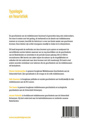 De geschiedenis van de middeleeuwen fascineert al generaties lang vele onderzoekers. Om meer te weten over het gedrag, de leefwereld en de ideeën van middeleeuwse mannen en vrouwen, beschikt de historicus/-a over een brede waaier aan geschreven bronnen. Deze teksten zijn echter doorgaans moeilijk te vinden én te interpreteren. Dit boek bespreekt de methodes om deze bronnen op te sporen en analyseert de verschillende soorten teksten waarover we nu nog beschikken om de geschiedenis van de Nederlanden en omstreken in de periode tussen pakweg 500 en 1500 te reconstrueren. Met kennis van zaken wijzen de auteurs op de mogelijkheden en valkuilen die het onderzoek naar deze bronnen met zich meebrengt. Dit boek is met andere woorden onmisbaar voor iedereen die de geschiedenis van de middeleeuwen wil bestuderen.