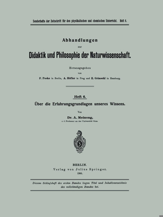 Die ebenso freundliche als ehrenvolle Einladung, die die Redaktion der "Abhandlungen zur Didaktik undPhilosophie der N aturwissen-' s6haften (. ( an mich hat ergehen lassen, bietet mir erwunschte Gelegenheit, an dieser Stelle von Erkenntnistatsachen zu handeln, die bei Unter- suchung dessen, was beim Erkennen vorgeht, meist im Hintergrunde bleiben. Zumal unter dem mehr traditionellen als bezeichnenden N amen "induktive Logik" hat man Operationen betrachtet, die man ganz wohl als Verarbeitung des durch die Erfahrung dargebotenen Wissens zu- sammenfassen kann. Das zu Bearbeitende selbst aber, eben die Er- fahrung, mochte leicht fur einebesondere Untersuchung zu einfach und zu durchsichtig scheinen. Aber ist es schon an sich klar, da keine Theorie es unterlassen darf, bis auf die letzten ihr zuganglichen Tat- sachen zuruckzugreifen, so kann man sich im besonderen leicht genug dav9n uberzeugen, da ein richtiges Erfassen dessen, was allem Er- fahrungswissen als solchem zugrunde liegt, nicht nur fur die Theorie sondern auch fur die Praxis des Erkennens von Belang ist. Vielleicht f'uhren aber die gegenwartigen Darlegungenauch zu der Uberzeugung, da speziell auf Wege und Ziele naturwissenschaftlicher Forschung durch Aufhellung der empirischen Erkenntnisgrundlagen nicht unwill- kommenes Licht falIt. Meine Darlegungen richten sich eher an den naturwissenschaftlichen als an den philosophischen Fachmann, obwohl sie auch diesem nicht n ur Bekanntes bringen mochten. Insbesondere hoffe ich Ausdrucke, die jenem ungewohnt sein konnten, nirgends ohne Bestimmung ihrer Be. .; deutung eingefuhrt zu haben. Ebenso ist ausdruckliche Stellungnahme zur zeitgenossischen Literatur, namentlich Polemik, die an die Adresse bestimmter Autoren zu richten gewesen ware, meist vermieden worden.