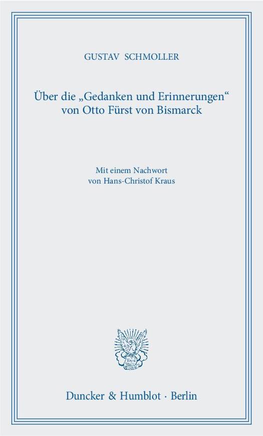 »Das politische Testament Bismarcks an das deutsche Volk, mit seltener Spannung seit Monaten erwartet, ist in den letzten Novembertagen ausgegeben worden; wie viele Tausende habe auch ich es, in der Lektüre nicht mehr enden könnend, verschlungen und eile, in diesen Blättern kurz darüber zu berichten [...]«Gustav Schmoller, in: Über die »Gedanken und Erinnerungen« von Otto Fürst von BismarckGustav Schmoller, der mitten im Ersten Weltkrieg am 27. Juli 1917 starb, zählte nicht nur zu den bekanntesten und bedeutendsten deutschen Gelehrten seiner Zeit, sondern auch zu den einflussreichsten Wissenschaftspolitikern des wilhelminischen Kaiserreichs. [...](Schmollers) genuine Wirklichkeitsnähe bedingte zugleich seine Zugehörigkeit zur politisch-wissenschaftlichen Elite des Kaiserreichs, und vor diesem Hintergrund wiederum war ihm in den verschiedensten Bereichen eine durchaus freiere, auch offenere Sprache möglich als manchen anderen Zeitgenossen [...]. Ein vielleicht besonders aufschlussreiches Beispiel gerade für diese Tatsache liefert Schmollers ausführliche Besprechung von Bismarcks »Gedanken und Erinnerungen«, die im Jahr 1898 nur wenige Wochen nach dem Tod des Altreichskanzlers erschienen und allgemein als öffentliche Sensation empfunden worden waren. [...]Tatsächlich war es eben nicht lediglich ein Memoirenwerk, sondern vor allem auch eine Art »Lehrbuch der Politik«, das Bismarck mit seinen Memoiren zu schreiben beabsichtigt hatte, und Schmoller war der erste der vielen Rezensenten dieses Werkes, der eben dies sofort erkannt und auf den Begriff gebracht hat - nicht zuletzt hierin liegt die besondere Bedeutung seiner frühen Besprechung der »Gedanken und Erinnerungen«.Aus dem Nachwort von Hans-Christof Kraus