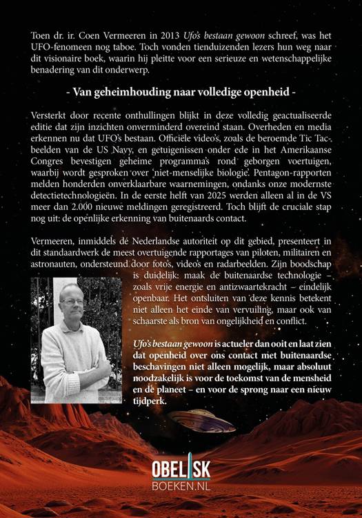 Van geheimhouding naar volledige openheid: toen dr. ir.Coen Vermeeren in 2013 Ufo’s bestaan gewoon schreef, was het UFO-fenomeen nog taboe. Toch vonden tienduizenden lezers hun weg naar dit visionaire boek, waarin hij pleitte voor een serieuze en wetenschappelijke benadering van dit onderwerp.