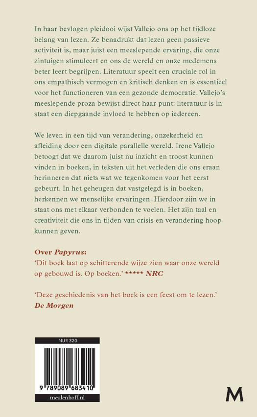 We leven in een tijd van verandering en onzekerheid. Irene Vallejo betoogt dat we daarom juist nu inzicht en troost kunnen vinden in boeken, in teksten uit het verleden die ons eraan herinneren dat niets wat we tegenkomen voor het eerst gebeurt. In het geheugen dat vastgelegd is in boeken, herkennen we menselijke ervaringen. Hierdoor zijn we in staat ons met elkaar verbonden te voelen. Het zijn taal en creativiteit die ons in tijden van crisis en verandering hoop kunnen geven.