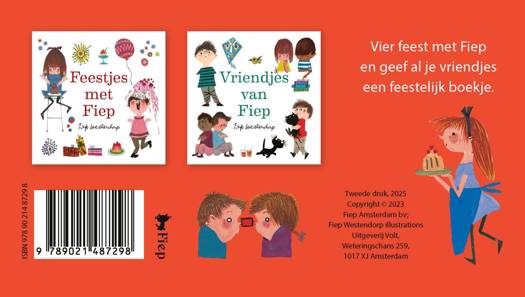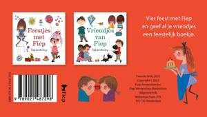 In een kleurrijk doosje met raampje zitten tien kleine boekjes van Fiep Westendorp: vijf keer Feestjes met Fiep en vijf keer Vriendjes van Fiep.