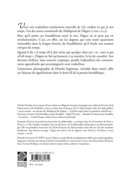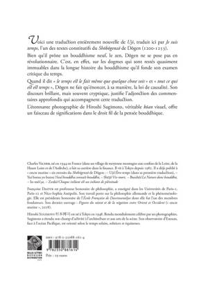 Voici une traduction entierement nouvelle de Uji, traduit ici par Je suis temps, l'un des textes constitutifs du Shobogenzo de Dogen (1200-1253). Bien qu'il prone un bouddhisme neuf, le zen, Dogen ne se pose pas en revolutionnaire. C'est, en effet, sur les dogmes qui sont restes quasiment immuables dans la longue histoire du bouddhisme qu'il fonde son examen critique du temps. Quand il dit le temps est le fait meme que quelque chose soit et tout ce qui est est temps , Dogen ne fait qu'enoncer, a sa maniere, la loi de causalite. Son discours brillant, mais souvent cryptique, justifie l'adjonction des commentaires approfondis qui accompagnent cette traduction. L'etonnante photographie de Hiroshi Sugimoto, veritable koan visuel, offre un faisceau de significations dans le droit fil de la pensee bouddhique.