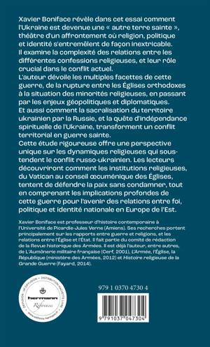 Xavier Boniface révèle dans cet essai comment l'Ukraine est devenue une « autre terre sainte », théâtre d'un affrontement où religion, politique et identité s'entremêlent de façon inextricable. Il examine la complexité des relations entre les différentes confessions religieuses, et leur rôle crucial dans le conflit actuel. L'auteur dévoile les multiples facettes de cette guerre, de la rupture entre les Églises orthodoxes à la situation des minorités religieuses, en passant par les enjeux géopolitiques et diplomatiques. Et aussi comment la sacralisation du territoire ukrainien par la Russie, et la quête d'indépendance spirituelle de l'Ukraine, transforment un conflit territorial en guerre sainte. Cette étude rigoureuse offre une perspective unique sur les dynamiques religieuses qui sous-tendent le conflit russo-ukrainien. Les lecteurs découvriront comment les institutions religieuses, du Vatican au conseil œcuménique des Églises, tentent de défendre la paix sans condamner, tout en comprenant les implications profondes de cette guerre pour l’avenir des relations entre foi, politique et identité nationale en Europe de l’Est.