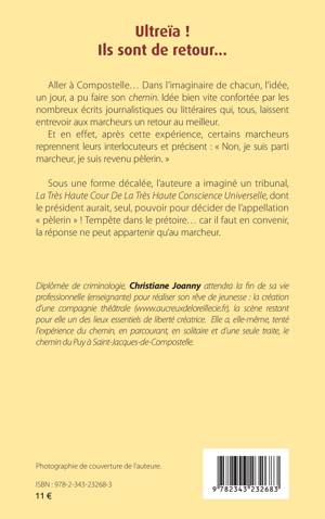 Aller à Compostelle... Dans l'imaginaire de chacun, l'idée, un jour, a pu faire son chemin. Idée bien vite confortée par les nombreux écrits journalistiques ou littéraires qui, tous, laissent entrevoir aux marcheurs un retour au meilleur. Et en effet, après cette expérience, certains marcheurs reprennent leurs interlocuteurs et précisent: Non, je suis parti marcheur, je suis revenu pèlerin. Sous une forme décalée, l'auteure a imaginé un tribunal, La Très Haute Cour De La Très Haute Conscience Universelle, dont le président aurait, seul, pouvoir pour décider de l'appellation pèlerin ! Tempête dans le prétoire... car il faut en convenir, la réponse ne peut appartenir qu'au marcheur.