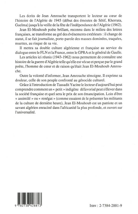 Les articles ici réunis nous permettent de connaître une histoire de la guerre d'Algérie telle qu'elle fut vécue et perçue par le grand poète Jean Amrouche (1906-1962). Outre la volonté d'informer, il témoigne, il exprime sa douleur, celle de son peuple confronté au génocide culturel.