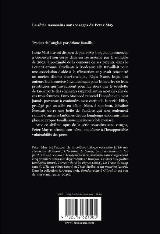Lucie Martin avait disparu depuis 1989 lorsqu'un promeneur a découvert son corps dans un lac asséché par la canicule de 2003, à proximité de la demeure de ses parents, dans le Lot-et-Garonne. Étudiante à Bordeaux, elle travaillait pour une association d'aide à la réinsertion et y avait rencontré un ancien détenu charismatique, Régis Blanc, lequel est aujourd'hui incarcéré à Lannemezan pour le meurtre de trois prostituées qui travaillaient pour lui. Alors que le squelette de Lucie porte des stigmates rapprochant sa mort de celle de ces trois femmes, Enzo MacLeod reprend l'enquête qui n'est jamais parvenue à confondre avec certitude le serial- killer, protégé par un alibi en béton. Mais, à son insu, l'obstiné Écossais ouvre une boîte de Pandore qui non seulement ranime d'anciens fantômes depuis longtemps endormis mais place sa propre famille sous une incoercible menace. Avec ce sixième opus de la série Assassins sans visages, Peter May confronte son héros enquêteur à l'insupportable vulnérabilité des pères.