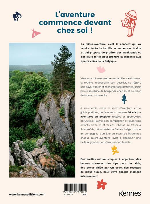L’aventure commence devant chez soi ! La micro-aventure, c’est le concept qui va rendre toute la famille accro au sac à dos et qui propose de profiter des week-ends et des jours fériés pour prendre la tangente aux quatre coins de la Belgique. Vivre une micro-aventure en famille, c’est casser la routine, redécouvrir son quartier, sa région, son pays, s’aérer et recharger ses batteries, saisir l’envie soudaine de bouger de chez soi et se créer de fabuleux souvenirs. À mi-chemin entre le récit d’aventure et le guide pratique, ce livre vous propose 24 micro-aventures en Belgique testées et approuvées par Aurélie Raigné, son compagnon et leurs trois enfants de 5, 10 et 15 ans. Chasse au trésor à Sainte-Ode, découverte du Sahara belge, balade en compagnie d’un âne au cœur de l’Ardenne : chaque micro-aventure invite à découvrir une belle région tout en s’amusant en famille. Des sorties nature simples à organiser, des bonnes adresses, des tips pour les kids, des bonus vidéo par QR code, des recettes de pique-nique, pour vivre chaque moment intensément !