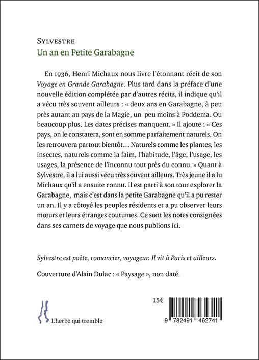 En 1936, Henri Michaux nous livre l’étonnant récit de son Voyage en Grande Garabagne. Plus tard dans la préface d’une nouvelle édition complétée par d’autres récits, il indique qu’il a vécu très souvent ailleurs : « deux ans en Garabagne, à peu près autant au pays de la Magie, un peu moins à Poddema. Ou beaucoup plus. Les dates précises manquent. » Il ajoute : « Ces pays, on le constatera, sont en somme parfaitement naturels. On les retrouvera partout bientôt… Naturels comme les plantes, les insectes, naturels comme la faim, l’habitude, l’âge, l’usage, les usages, la présence de l’inconnu tout près du connu. » Quant à Sylvestre, il a lui aussi vécu très souvent ailleurs. Très jeune il a lu Michaux qu’il a ensuite connu. Il est parti à son tour explorer la Garabagne, mais c’est dans la petite Garabagne qu’il a pu rester un an. Il y a côtoyé les peuples résidents et a pu observer leurs mœurs et leurs étranges coutumes. Ce sont les notes consignées dans ses carnets de voyage que nous publions ici.