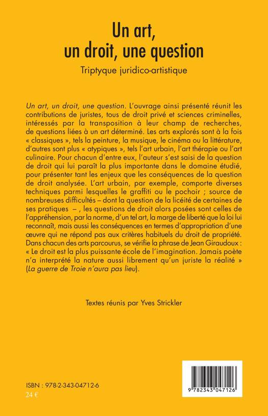 Cet ouvrage présente des contributions de juristes, tous de droit privé et sciences criminelles, intéressés par la transposition à leur champ de recherches, de questions liées à un art déterminé. Les arts explorés sont à la fois "classiques", tels la peinture, la musique, le cinéma ou la littérature, d'autres sont plus "atypiques", tels l'art urbain, l'art thérapie ou culinaire. Pour chacun d'entre eux, l'auteur s'est saisi de la question de droit qui lui paraît la plus importante dans le domaine étudié.