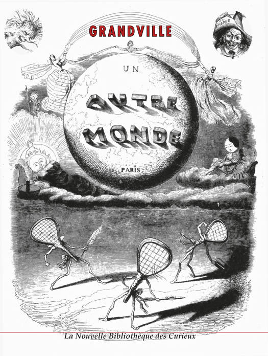 GRANDVILLE (Jean-Ignace-Isidore GÉRARD, dit), caricaturiste français, né à Nancy en 1803, mort à Paris en 1847. Son père était peintre en miniature ; son grand-père était un comédien de province, qui changea son nom patronymique de Gérard en celui de Grandville. Après Gavarni et Daumier, Grandville occupe la première place dans l’histoire de la caricature moderne en France. Nature fine et délicate, où dominait l’esprit d’observation, il a fidèlement reproduit, du bout de son crayon railleur, les travers et les ridicules de son temps, mais il l’a fait d’une manière qui lui est toute personnelle, avec un parti pris qui finit, chez lui, par dégénérer en manie, celui de donner la physionomie, les vices et les passions de l’homme, d’abord aux animaux et aux plantes, puis à toutes sortes d’objets quelconques, au risque de tomber dans l’incompréhensible et le baroque. (Pierre Larousse, Grand dicitionnaire universel du XIXème siècle). UN AUTRE MONDE est l’une de ses dernières oeuvres avant que la faucheuse, souvent raillée dans ses croquis, ne l’emporte à 44 ans après avoir, lui-même, perdu sa femme et ses trois enfants. Un autre monde pourrait être considéré comme une oeuvre fantastique voire surréaliste et qui, malheureusement, ne trouva pas son public malgré les succès précédents des Métamorphoses du jour (1828), des fleurs animées, des fables de la Fontaine, des cents proverbes, les Animaux peints par eux-mêmes, les chansons de Béranger, Don Quichotte, les Voyages de Gulliver, les Fables de Florian, Jérôme Paturot et bien d’autres.