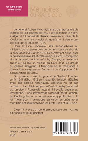 Le général Robert Odic a été le témoin à Vichy, à Alger et à Londres de deux mouvements: celui de la révolution nationale et celui du gaullisme. Sous le Front populaire, ses responsabilités au ministère de la guerre puis de commandant en chef de la zone aérienne Sud en 1940 lui permettent d'expliquer la défaite militaire. Chef d'état-major à Vichy, il comprend vite la nature du régime de Vichy. À Alger, il témoigne de sa résistance à l'ennemi en réorganisant l'armée et en s'opposant à la collaboration de Vichy. Ses entretiens avec le général de Gaulle à Londres en 1941-1942 sont racontés de façon détaillée avec des paroles historiques. Il en fait le rapport à l'amiral Leahy, bras droit du président Roosevelt, quand il travaille ensuite au Pentagone. Il juge sévèrement le coup d'État du général de Gaulle grâce à sa connaissance approfondie de la loi Theveneuc. Il développe sa vision européenne et mondiale des relations avec les États-Unis et la Russie. C'est l'itinéraire d'un général républicain, d'un homme d'honneur et d'un résistant.