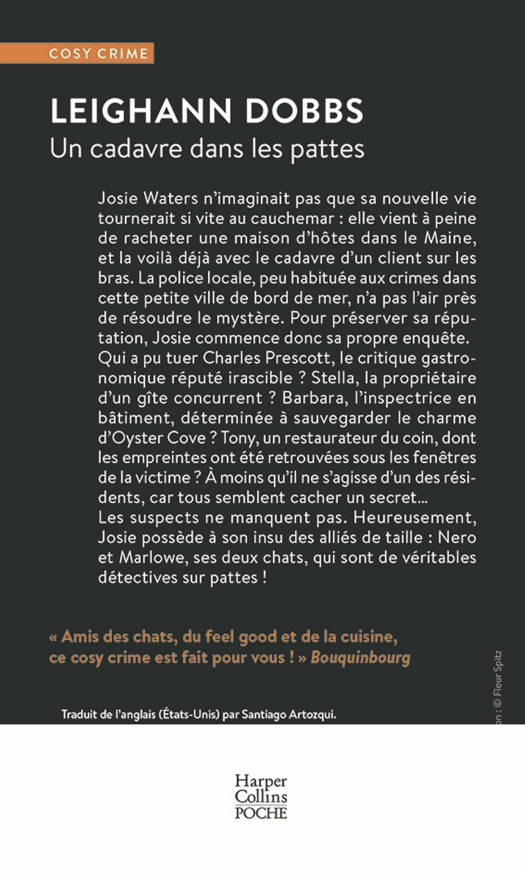 Josie Waters n’imaginait pas que sa nouvelle vie tournerait si vite au cauchemar : elle vient à peine de racheter une maison d’hôtes dans le Maine, et la voilà déjà avec le cadavre d’un client sur les bras. La police locale, peu habituée aux crimes dans cette petite ville de bord de mer, n’a pas l’air près de résoudre le mystère. Pour préserver sa réputation, Josie commence donc sa propre enquête. Qui a pu tuer Charles Prescott, le critique gastronomique réputé irascible ? Stella, la propriétaire d’un gîte concurrent ? Barbara, l’inspectrice en bâtiment, déterminée à sauvegarder le charme d’Oyster Cove ? Tony, un restaurateur du coin, dont les empreintes ont été retrouvées sous les fenêtres de la victime ? À moins qu’il ne s’agisse d’un des résidents, car tous semblent cacher un secret… Les suspects ne manquent pas. Heureusement, Josie possède à son insu des alliés de taille : Nero et Marlowe, ses deux chats, qui sont de véritables détectives sur pattes ! Traduit de l’anglais (États-Unis) par Santiago Artozqui.