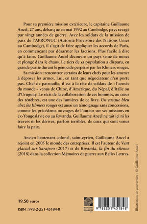 Pour sa premiere mission exterieure, le capitaine Guillaume Ancel, 27 ans, debarque en mai 1992 au Cambodge, pays ravage par vingt annees de guerre. Avec les soldats de la mission de paix de l'APRONUC (Autorite Provisoire des Nations Unies au Cambodge), il s'agit de faire appliquer les accords de Paris, en commencant par desarmer les factions. Plus facile a dire qu'a faire. Guillaume Ancel decouvre un pays seme de mines et plonge dans le chaos. Le tiers de sa population a disparu, en grande partie durant le genocide perpetre par les Khmers rouges. Sa mission: rencontrer certains de leurs chefs pour les amener a deposer les armes. Lui, en tant que negociateur n'en porte pas. Chef de patrouille, il est a la tete de soldats de l'armee du monde venus de Chine, d'Amerique, du Nepal, d'Italie ou d'Uruguay. Le recit de la collaboration de ces hommes, au coeur des tenebres, est une des lumieres de ce livre. Un casque bleu chez les Khmers rouges est aussi un temoignage sans concessions, comme les precedents ouvrages de l'auteur sur ses missions en ex-Yougoslavie ou au Rwanda. Guillaume Ancel ne tait ici ni les travers ni les derives, parfois terribles, de ceux qui sont venus faire la paix.