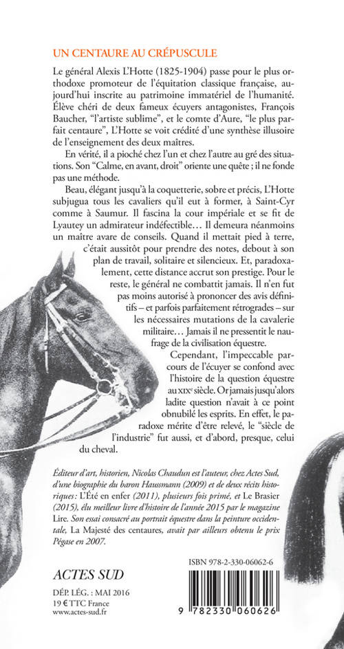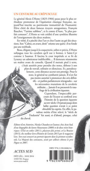 Le général Alexis L'Hotte passe pour le plus orthodoxe promoteur de l'équitation classique française, aujourd'hui inscrite au patrimoine immatériel de l'humanité. Elève chéri de deux fameux écuyers antagonistes, François Baucher, « l'artiste sublime », et le comte d'Aure, « le plus parfait centaure », L'Hotte se voit crédité d'une synthèse illusoire de l'enseignement des deux maîtres.