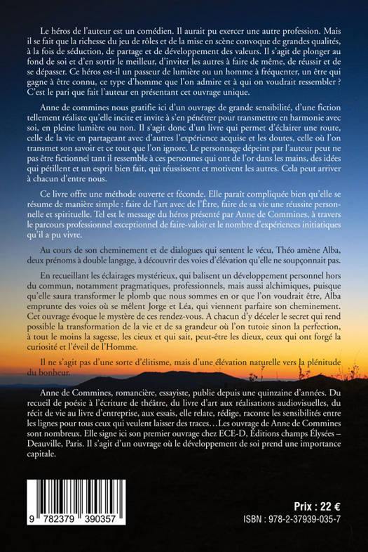 Cet ouvrage est un livre d’éclairage de développement personnel par les dialogues et la réflexion sur soi. Il offre l'opportunité de se grandir, de s'imprégner des clés d’une élévation. Ce livre une invitation à partager un savoir. Il montre comment on peut faire de l’Art avec de l’Être. Tel est le message de ce Théo présenté par Anne de Commines, comédien, metteur en scène, à travers un parcours professionnel exceptionnel et nombre d'étapes initiatiques. Théo instruit l’âme de ses étudiants et de ses publics. Chacun peut y déceler l’Åuvre secrète ou mystérieuse qui rend possible de se transformer, de s'améliorer, de s'imprégner d'une tradition féconde. Cette fiction tellement réelle parle à tout qui veut s'améliorer dans son activité, artistique ou pas.