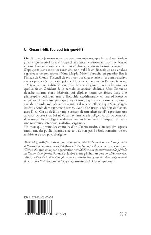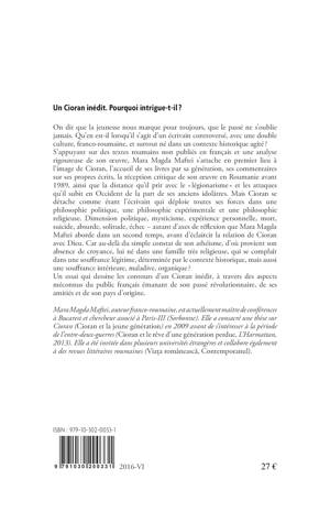 S'appuyant sur des textes roumains non publiés en français et une analyse rigoureuse de son œuvre, Mara Magda Maftei s'attache en premier lieu à l'image de Cioran, l'accueil de ses livres par sa génération, ses commentaires sur ses propres écrits, la réception critique de son œuvre en Roumanie avant 1989, ainsi que la distance qu'il prit avec le « légionarisme » et les attaques qu'il subit en Occident de la part de ses anciens idolâtres. Mais Cioran se détache comme étant l'écrivain qui déploie toutes ses forces dans une philosophie politique, une philosophie expérimentale et une philosophie religieuse. Dimension politique, mysticisme, expérience personnelle, mort, suicide, absurde, solitude, échec – autant d'axes de réflexion que Mara Magda Maftei aborde dans un second temps, avant d'éclaircir la relation de Cioran avec Dieu. Car au-delà du simple constat de son athéisme, d'où provient son absence de croyance, lui né dans une famille très religieuse, qui se complaît dans une souffrance légitime, déterminée par le contexte historique, mais aussi une souffrance intérieure, maladive, organique ?