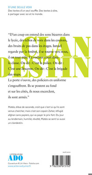 Les Paradis est un quartier plutôt paisible jusqu'à ce que la brigade des stups débarque dans le lycée, armes à la main. Matéo est arrêté en possession de cannabis. Mais c'est son copain Zaher, réfugié afghan, qui est accusé de trafic avant d'être expulsé. Du jour au lendemain, humilié, révolté, Matéo se sent lui aussi un clandestin. Son monologue est un poignant manifeste contre l'abus d'autorité et l'injustice.