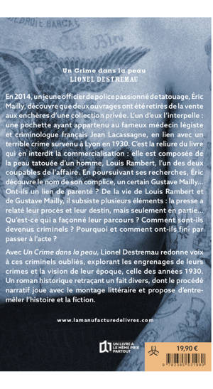 Avec Un Crime dans la peau, Lionel Destremau redonne voix à ces criminels oubliés, explorant les engrenages de leurs crimes et la vision de leur époque, celle des années 1930. Un roman historique retraçant un fait divers, dont le procédé narratif joue avec le montage littéraire et propose d’entremêler l’histoire