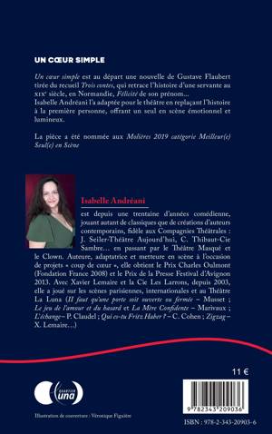 Un coeur simple est au départ une nouvelle de Gustave Flaubert tirée du recueil Trois contes, qui retrace l'histoire d'une servante au XIXe siècle, en Normandie, Félicité de son prénom... Isabelle Andréani l'a adaptée pour le théâtre en replaçant l'histoire à la première personne, offrant un seul en scène émotionnel et lumineux. La pièce a été nommée aux Molières 2019 catégorie Meilleur(e) Seul(e) en Scène.