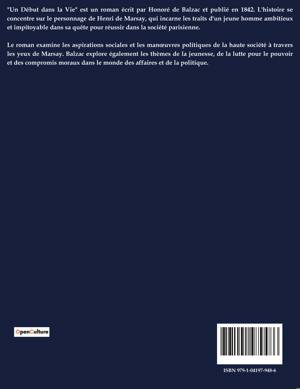 "Un Début dans la Vie" est un roman écrit par Honoré de Balzac et publié en 1842. L'histoire se concentre sur le personnage de Henri de Marsay, qui incarne les traits d'un jeune homme ambitieux et impitoyable dans sa quête pour réussir dans la société parisienne.