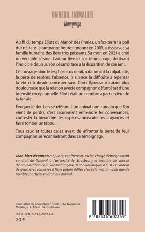 Au fil du temps, Eliott du Manoir des Presles, un fox-terrier à poil dur né dans la campagne bourguignonne en 2009, a tissé avec sa famille humaine des liens très puissants. Sa mort en 2023 a créé un véritable séisme. L'auteur livre ici son témoignage, décrivant l'indicible douleur, son désarroi face à la disparition de son ami. Cet ouvrage aborde les phases du deuil, notamment la culpabilité, la perte de repères, l'absence, le silence, la difficulté à repenser la vie et à devoir continuer sans Eliott. Épreuve d'autant plus douloureuse que la relation avec le compagnon défunt était d'une intensité exceptionnelle. Eliott était un membre à part entière de la famille. Évoquer le deuil en se référant à un animal non humain que l'on vient de perdre, c'est assurément enfreindre les convenances, contester la hiérarchie des espèces, bousculer les croyances et faire tomber un tabou. Tous ceux et toutes celles ayant dû affronter la perte de leur compagnon se reconnaîtront dans ce témoignage.