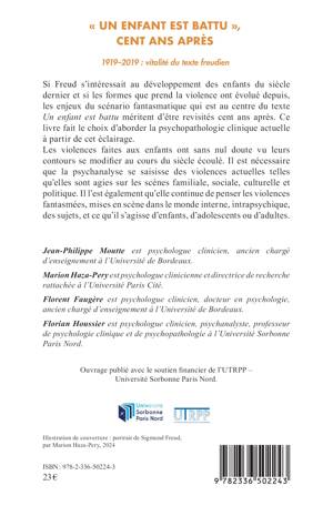 Si Freud s'intéressait au développement des enfants du siècle dernier et si les formes que prend la violence ont évolué depuis, les enjeux du scénario fantasmatique qui est au centre du texte Un enfant est battu méritent d'être revisités cent ans après. Ce livre fait le choix d'aborder la psychopathologie clinique actuelle à partir de cet éclairage. Les violences faites aux enfants ont sans nul doute vu leurs contours se modifier au cours du siècle écoulé. Il est nécessaire que la psychanalyse se saisisse des violences actuelles telles qu'elles sont agies sur les scènes familiale, sociale, culturelle et politique. Il l'est également qu'elle continue de penser les violences fantasmées, mises en scène dans le monde interne, intrapsychique, des sujets, et ce qu'il s'agisse d'enfants, d'adolescents ou d'adultes.