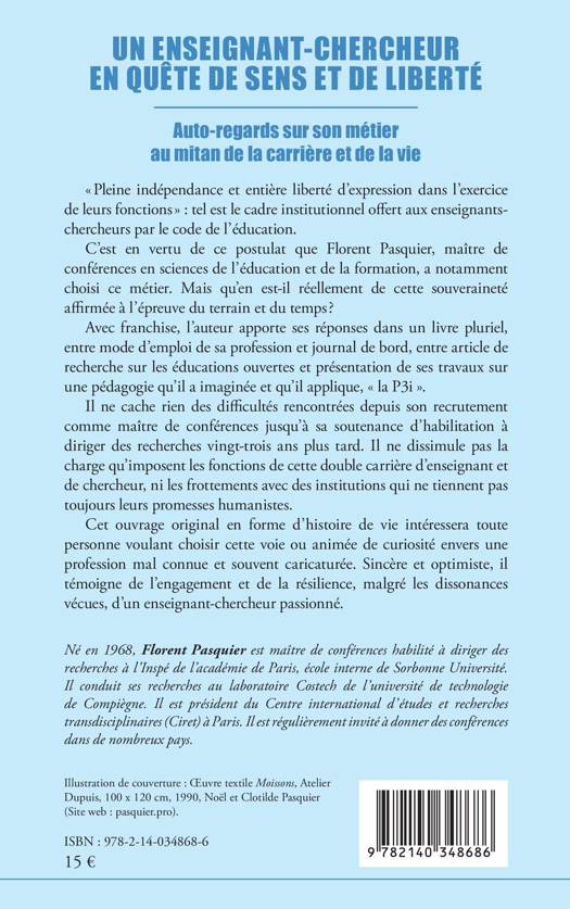 « Pleine indépendance et entière liberté d’expression dans l’exercice de leurs fonctions » : tel est le cadre institutionnel offert aux enseignants- chercheurs par le code de l’éducation. C’est en vertu de ce postulat que Florent Pasquier, maître de conférences en sciences de l’éducation et de la formation, a notamment choisi ce métier. Mais qu’en est-il réellement de cette souveraineté affirmée à l’épreuve du terrain et du temps ? Avec franchise, l’auteur apporte ses réponses dans un livre pluriel, entre mode d’emploi de sa profession et journal de bord, entre article de recherche sur les éducations ouvertes et présentation de ses travaux sur une pédagogie qu’il a imaginée et qu’il applique, « la P3i ». Il ne cache rien des difficultés rencontrées depuis son recrutement comme maître de conférences jusqu’à sa soutenance d’habilitation à diriger des recherches vingt-trois ans plus tard. Il ne dissimule pas la charge qu’imposent les fonctions de cette double carrière d’enseignant et de chercheur, ni les frottements avec des institutions qui ne tiennent pas toujours leurs promesses humanistes. Cet ouvrage original en forme d’histoire de vie intéressera toute personne voulant choisir cette voie ou animée de curiosité envers une profession mal connue et souvent caricaturée. Sincère et optimiste, il témoigne de l’engagement et de la résilience, malgré les dissonances vécues, d’un enseignant-chercheur passionné.