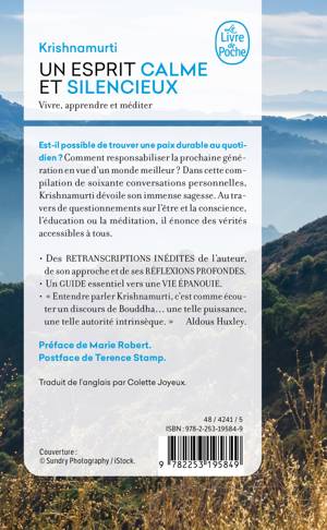 Est-il possible de trouver une paix durable au quotidien ? Comment responsabiliser la prochaine génération en vue d’un monde meilleur ? Dans cette compilation de soixante conversations personnelles, Krishnamurti dévoile son immense sagesse. Au travers de questionnements sur l’être et la conscience, l’éducation ou la méditation, il énonce des vérités accessibles à tous. Jiddu Krishnamurti (1895-1986) est l’un des maîtres spirituels les plus estimés du XXe siècle. Son enseignement est pour beaucoup une grande source d’inspiration. Ses œuvres figurent au programme des facultés de philosophie, de psychologie et de sciences de l’éducation de plus d’une centaine d’universités et de collèges américains.