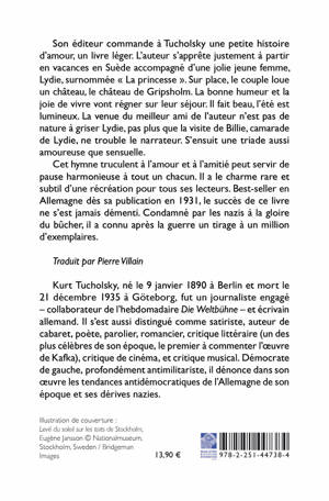 Son editeur commande a Tucholsky une petite histoire d'amour, un livre leger. L'auteur s'apprete justement a partir en vacances en Suede accompagne d'une jolie jeune femme, Lydie, surnommee " La princesse ". Sur place, le couple loue un chateau, le chateau de Gripsholm. La bonne humeur et la joie de vivre vont regner sur leur sejour. Il fait beau, l'ete est lumineux. La venue du meilleur ami de l'auteur n'est pas de nature a griser Lydie, pas plus que la visite de Billie, camarade de Lydie, ne trouble le narrateur. S'ensuit une triade aussi amoureuse que sensuelle. Cet hymne truculent a l'amour et a l'amitie peut servir de pause harmonieuse a tout un chacun. Il a le charme rare et subtil d'une recreation pour tous ses lecteurs. Best-seller en Allemagne des sa publication en 1931, le succes de ce livre ne s'est jamais dementi. Condamne par les nazis a la gloire du bucher, il a connu apres la guerre un tirage a un million d'exemplaires.