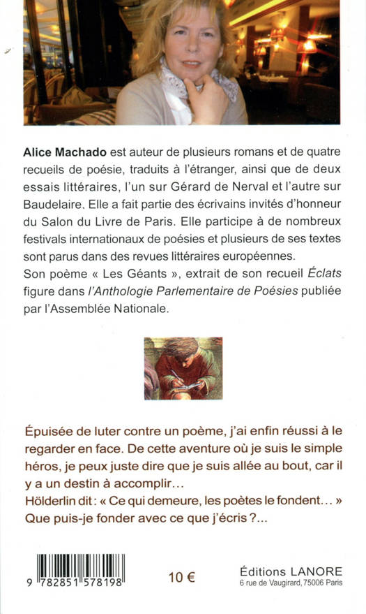 « Épuisée de lutter contre un poème, j'ai enfin réussi à le regarder en face. De cette aventure où je suis le simple héros, je peux juste dire que je suis allée au bout, car il y a un destin à accomplir... Hölderlin dit : "Ce qui demeure, les poètes le fondent..." Que puis-je fonder avec ce que j'écris ? »